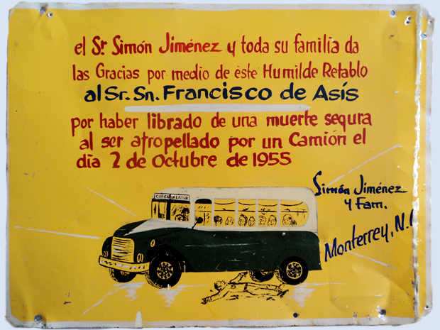 Sr Simón Jiménez and all his family give thanks to Saint Francis of Assisi with this humble retablo for saving him from a certain death after being run over by a bus on 2 October 1955. Simón Jiménez and family. (Monterrey, Nuevo León).